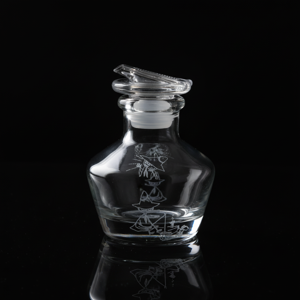 透明なガラスの中に醤油を注いだ瞬間、白で描かれたスナフキンのシルエットがふわりと浮かび上がります。帽子をかぶり、ハーモニカを手にしたあの自由な後ろ姿が、ガラスの向こうでそっと佇む——これは単なる醤油差しではありません。