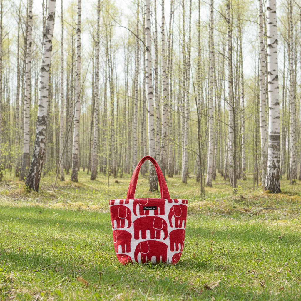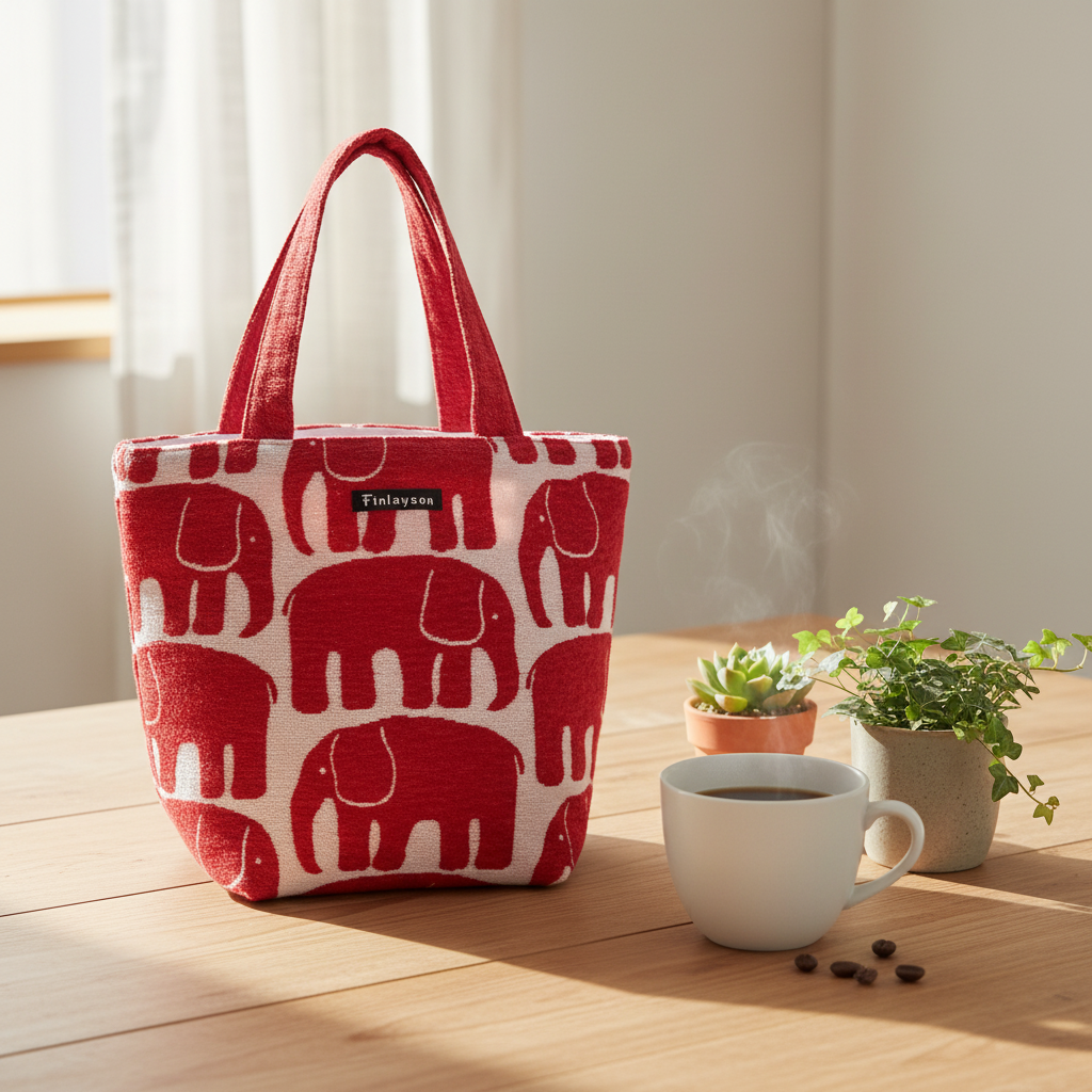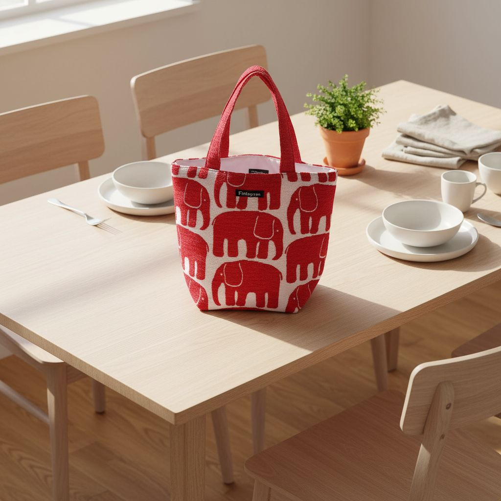 フィンレイソン「エレファンティ」ランチトートバッグ。 フィンランドで約200年にわたって愛されてきたテキスタイルブランド、フィンレイソンの象徴的なゾウのデザインが、しっかりしたゴブラン織りで手のひらサイズのランチバッグになりました。