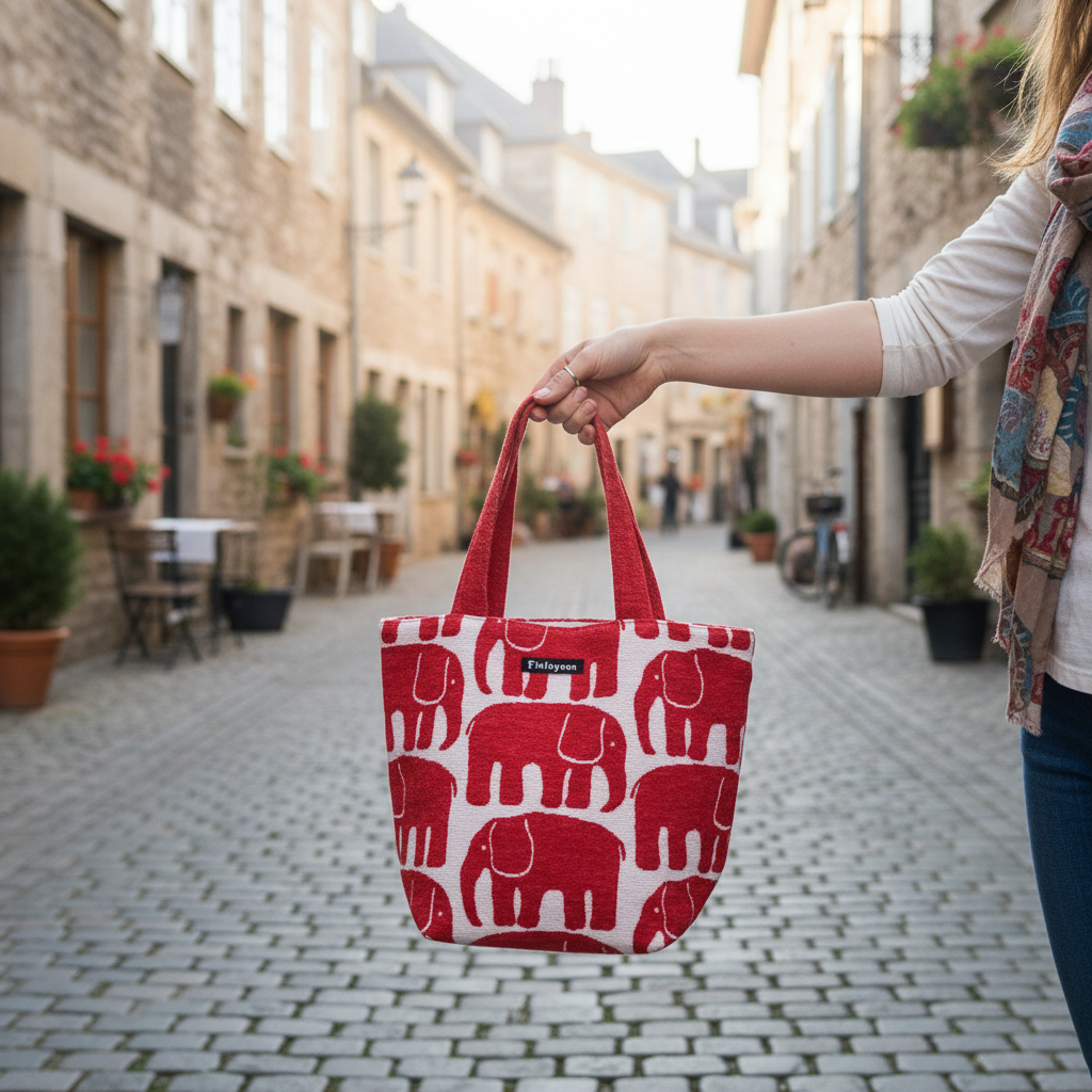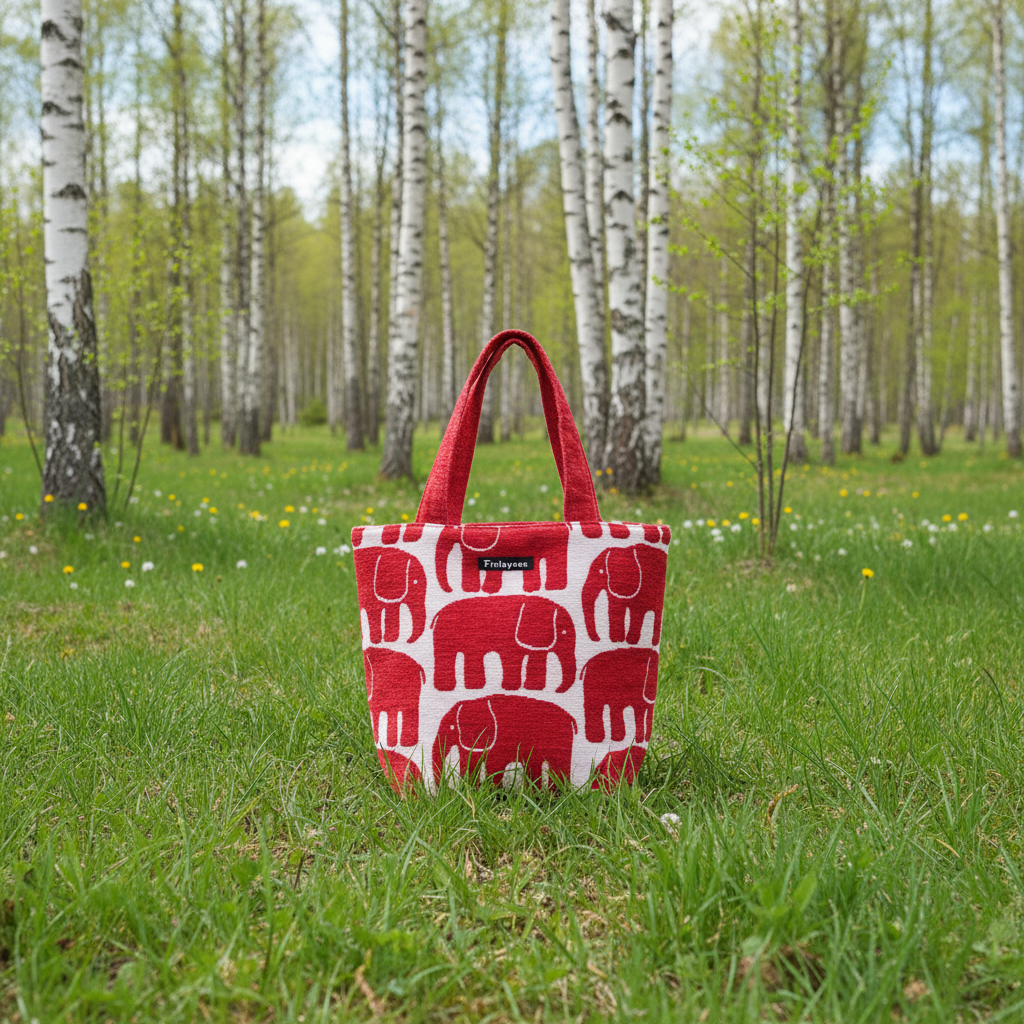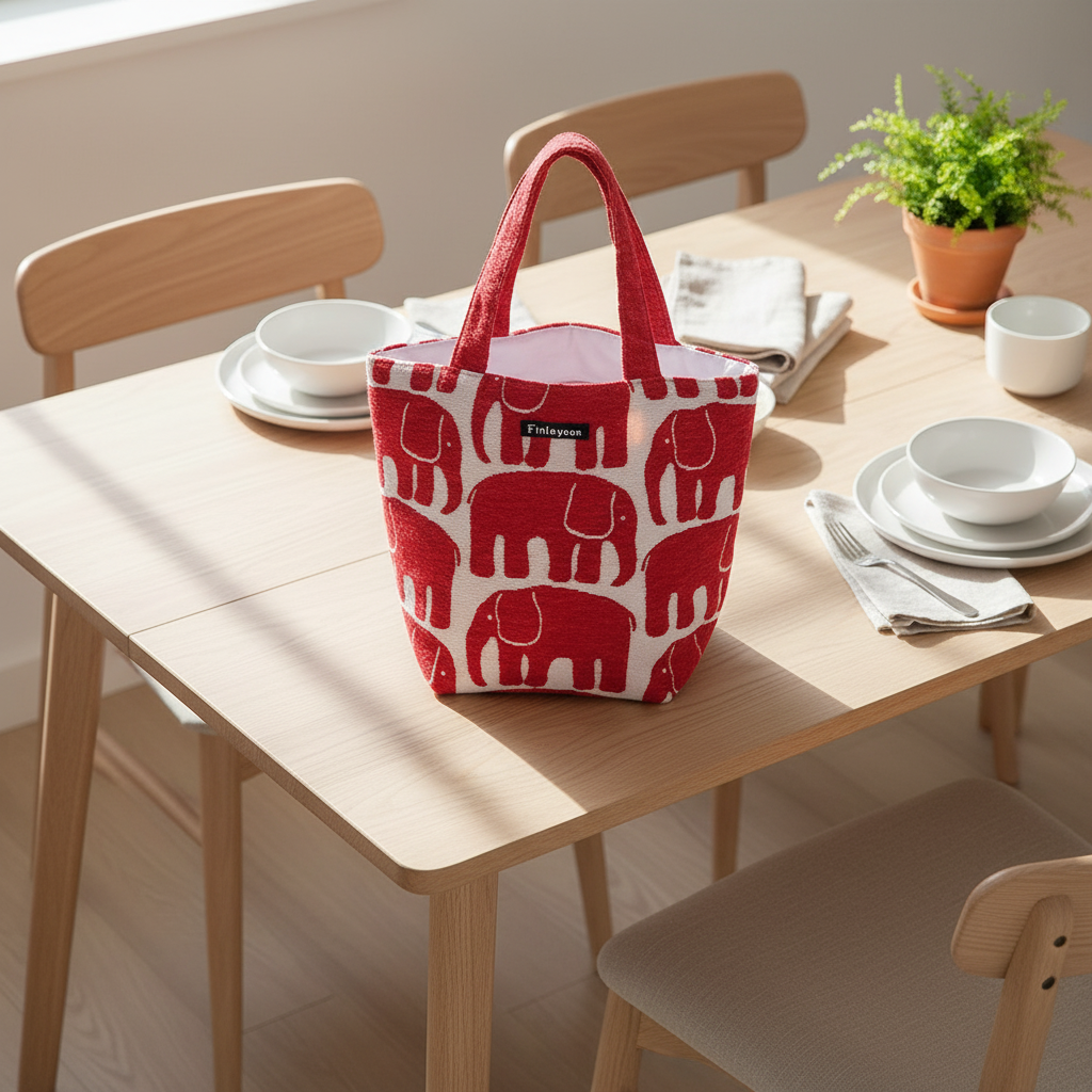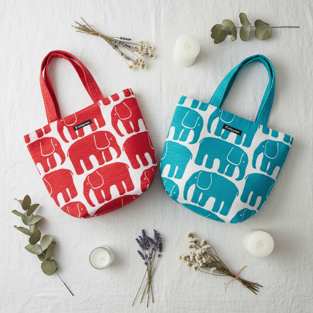 フィンレイソン「エレファンティ」ランチトートバッグ。 フィンランドで約200年にわたって愛されてきたテキスタイルブランド、フィンレイソンの象徴的なゾウのデザインが、しっかりしたゴブラン織りで手のひらサイズのランチバッグになりました。